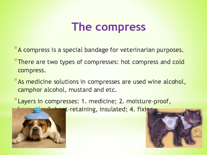 As medicine solutions in compresses are used wine alcohol, camphor alcohol, mustard and etc.