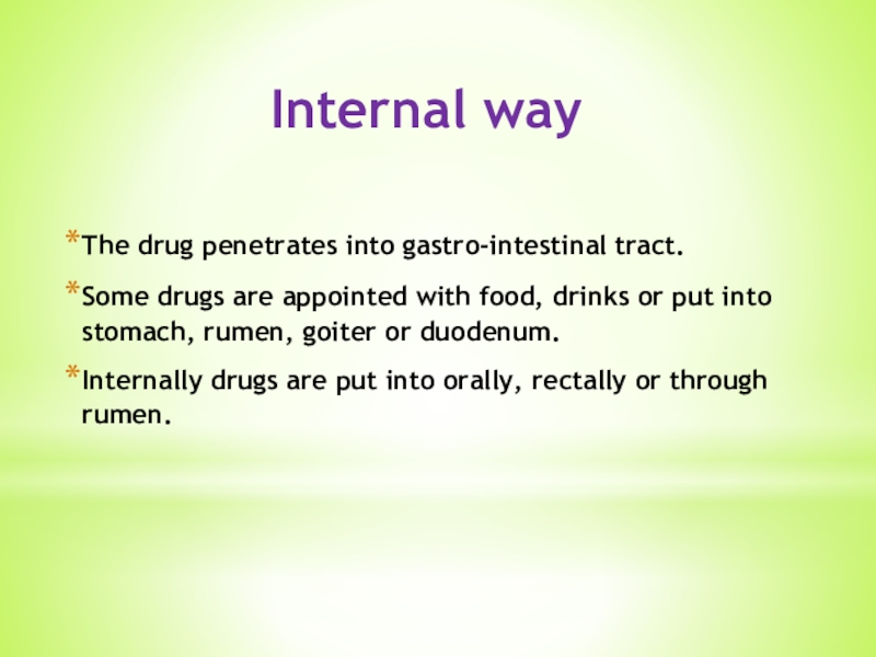 food, drinks or put into stomach, rumen, goiter or duodenum.