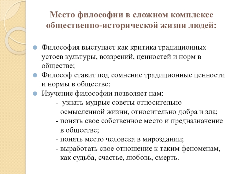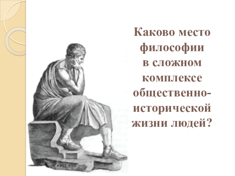 Слайд 28Место философии в сложном комплексе общественно-исторической жизни людей: