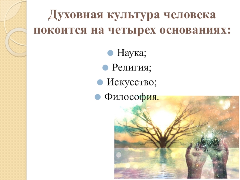 Слайд 29Духовная культура человека покоится на четырех основаниях: