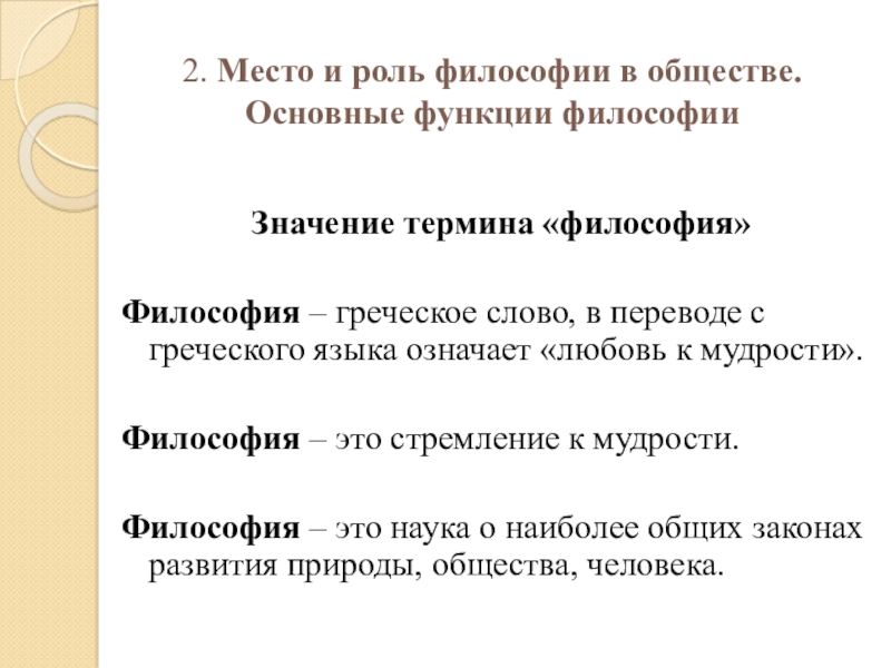 Философия – греческое слово, в переводе с греческого языка означает «любовь к мудрости».