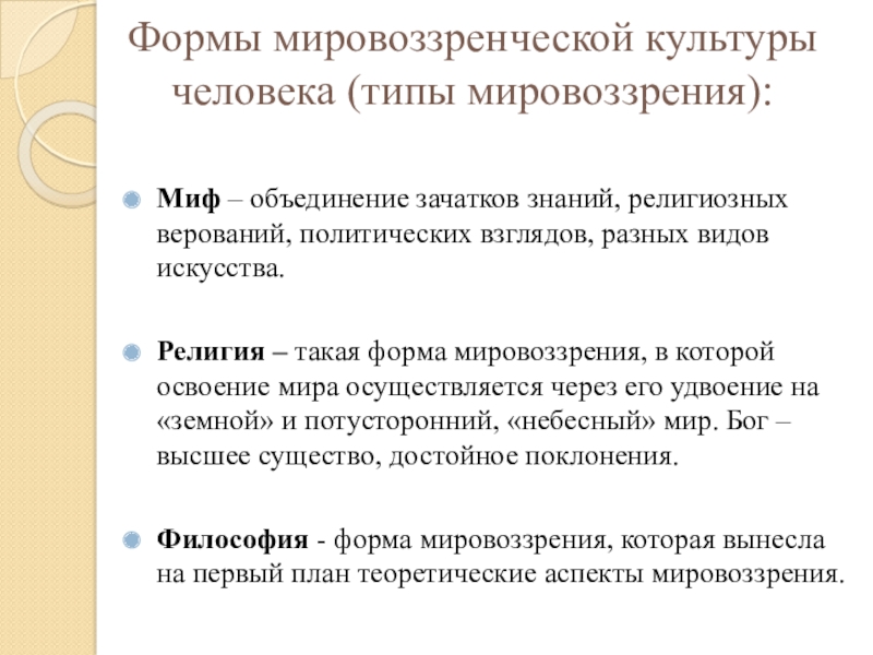 Слайд 5Формы мировоззренческой культуры человека (типы мировоззрения):