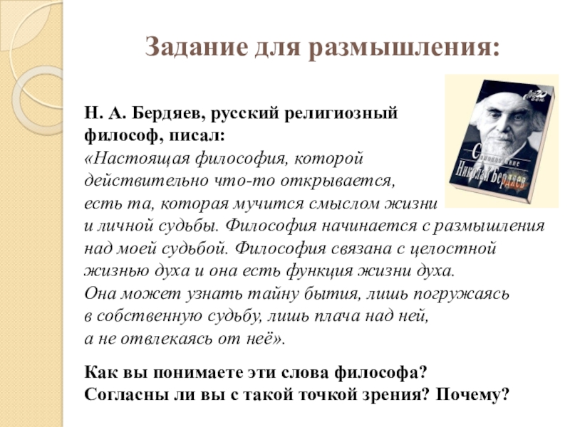 и личной судьбы. Философия начинается с размышления над моей судьбой. Философия связана с целостной жизнью духа и она есть функция жизни духа.