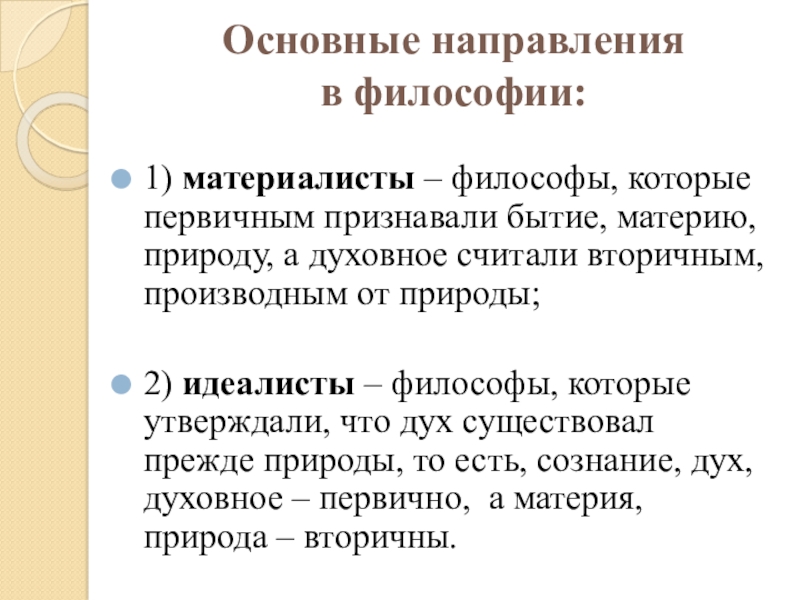 1) материалисты – философы, которые первичным признавали бытие,