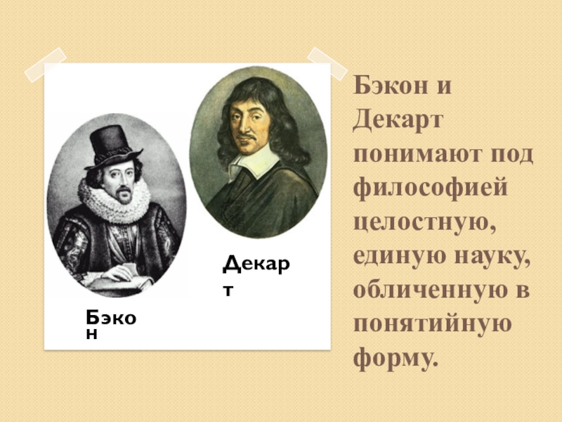 Слайд 24Бэкон и Декарт понимают под философией целостную, единую науку, обличенную в