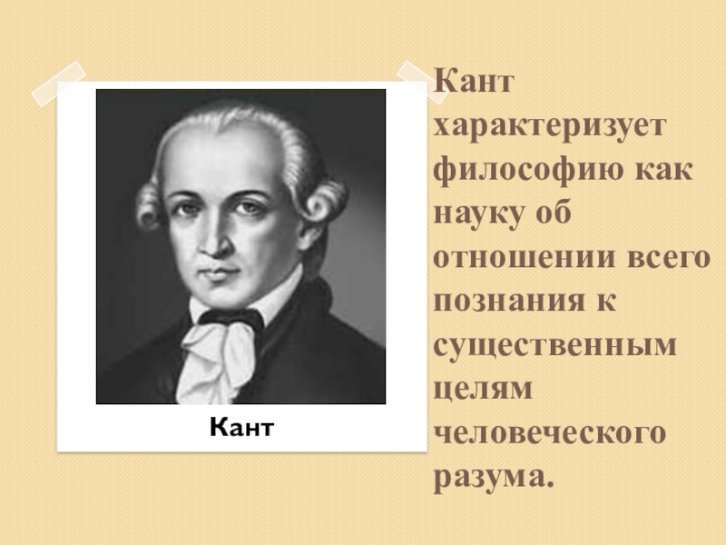 Слайд 25Кант характеризует философию как науку об отношении всего познания к существенным