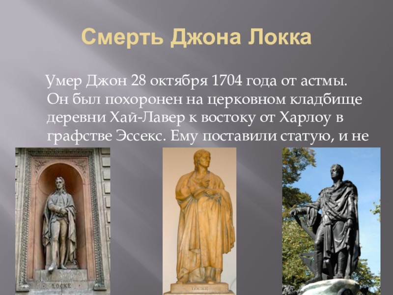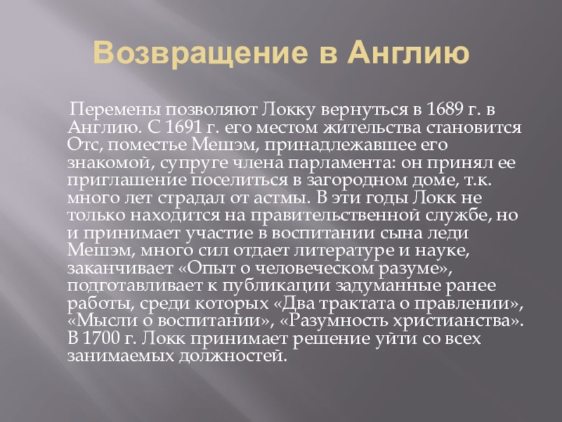 г. в Англию. С 1691 г. его местом жительства становится Отс, поместье Мешэм, принадлежавшее его знакомой, супруге члена парламента: он принял ее приглашение поселиться в загородном доме, т.к. много лет страдал от астмы. В эти годы Локк не только находится на правительственной службе, но и принимает участие в воспитании сына леди Мешэм, много сил отдает литературе и науке, заканчивает «Опыт о человеческом разуме», подготавливает к публикации задуманные ранее работы, среди которых «Два трактата о правлении», «Мысли о воспитании», «Разумность христианства». В 1700 г. Локк принимает решение уйти со всех занимаемых должностей.