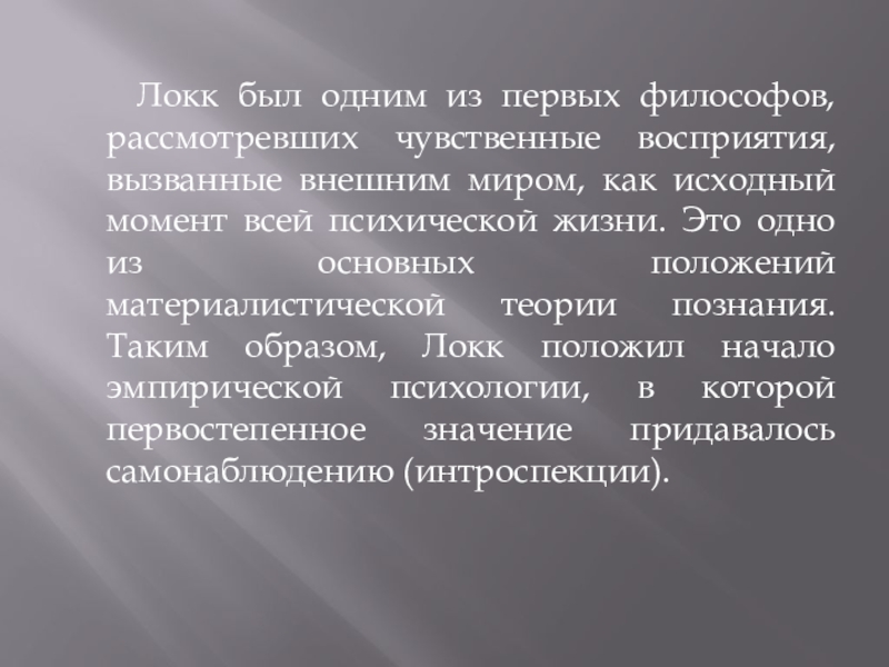 вызванные внешним миром, как исходный момент всей психической жизни. Это одно из основных положений материалистической теории познания. Таким образом, Локк положил начало эмпирической психологии, в которой первостепенное значение придавалось самонаблюдению (интроспекции).