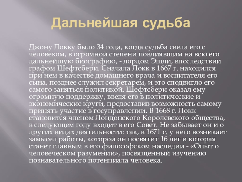 свела его с человеком, в огромной степени повлиявшим на всю его дальнейшую биографию, - лордом Эшли, впоследствии графом Шефтсбери. Сначала Локк в 1667 г. находился при нем в качестве домашнего врача и воспитателя его сына, позднее служил секретарем, и это сподвигло его самого заняться политикой. Шефтсбери оказал ему огромную поддержку, введя его в политические и экономические круги, предоставив возможность самому принять участие в госуправлении. В 1668 г. Локк становится членом Лондонского Королевского общества, в следующем году входит в его Совет. Не забывает он и о других видах деятельности: так, в 1671 г. у него возникает замысел работы, которой он посвятит 16 лет и которая станет главным в его философском наследии - «Опыт о человеческом разумении», посвященный изучению познавательного потенциала человека.