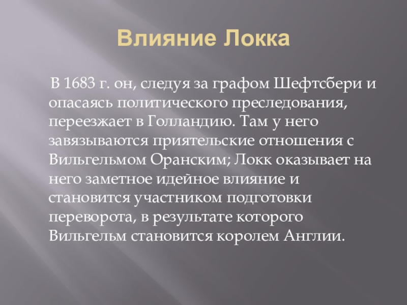 и опасаясь политического преследования, переезжает в Голландию. Там у него завязываются приятельские отношения с Вильгельмом Оранским; Локк оказывает на него заметное идейное влияние и становится участником подготовки переворота, в результате которого Вильгельм становится королем Англии.