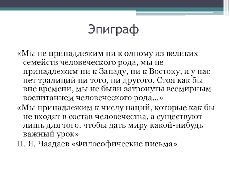 мы не принадлежим ни к Западу, ни к Востоку, и у нас нет традиций ни того, ни другого. Стоя как бы вне времени, мы не были затронуты всемирным воспитанием человеческого рода…»