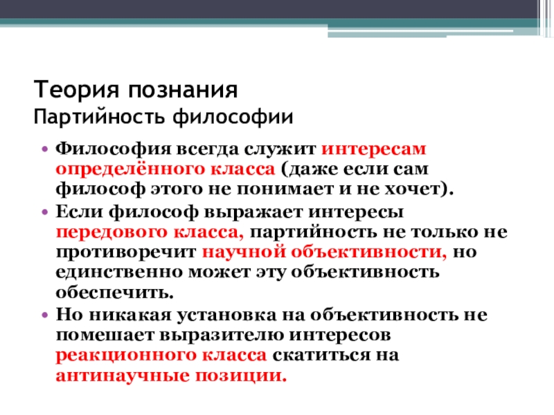 Если философ выражает интересы передового класса, партийность не только не противоречит научной объективности, но единственно может эту объективность обеспечить.