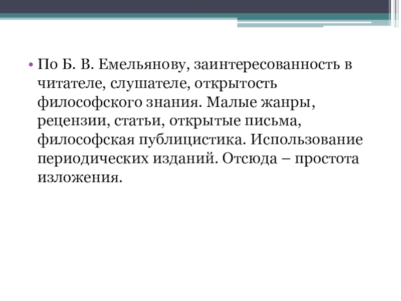 Слайд 10По Б. В. Емельянову, заинтересованность в читателе, слушателе, открытость философского знания.