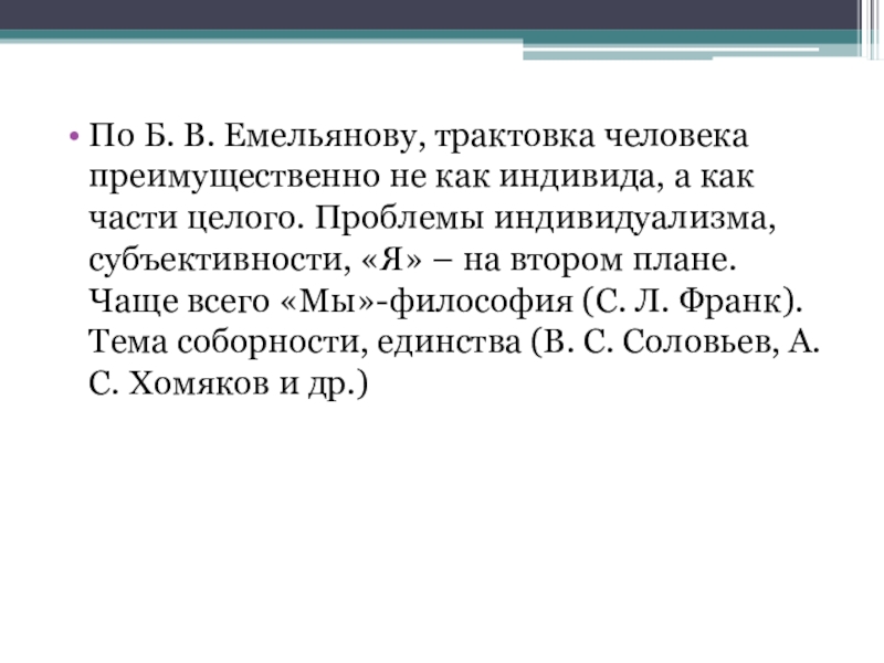 Слайд 9По Б. В. Емельянову, трактовка человека преимущественно не как индивида, а