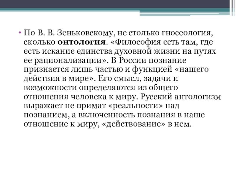 Слайд 5По В. В. Зеньковскому, не столько гносеология, сколько онтология. «Философия есть