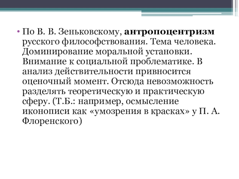 Слайд 6По В. В. Зеньковскому, антропоцентризм русского философствования. Тема человека. Доминирование моральной