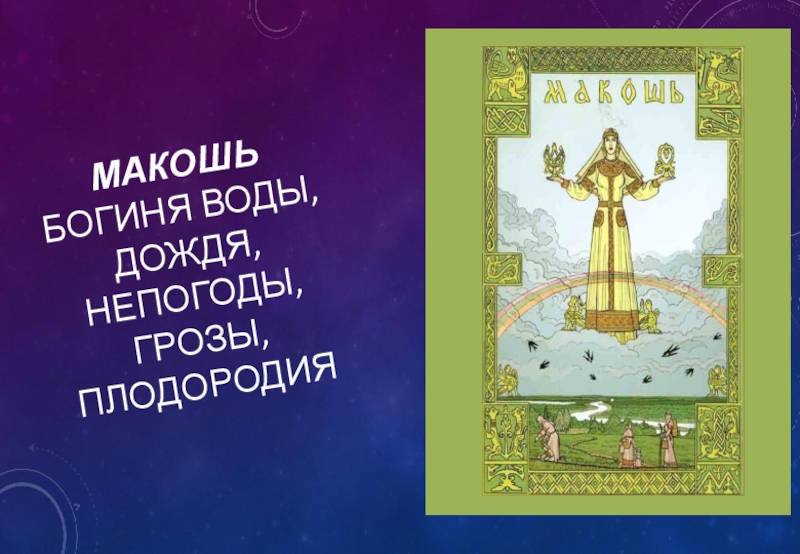 Слайд 17Макошь богиня воды, дождя, непогоды, грозы, плодородия