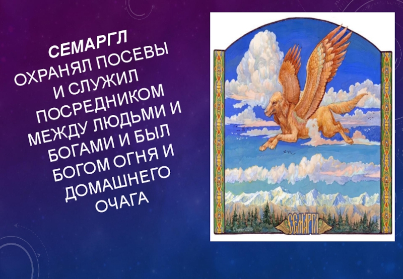 Слайд 19Семаргл охранял посевы и служил посредником между людьми и богами и был