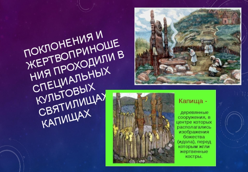 Слайд 44Поклонения и жертвоприношения проходили в специальных культовых святилищах-капищах