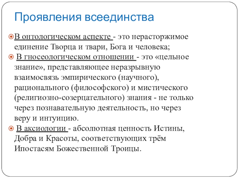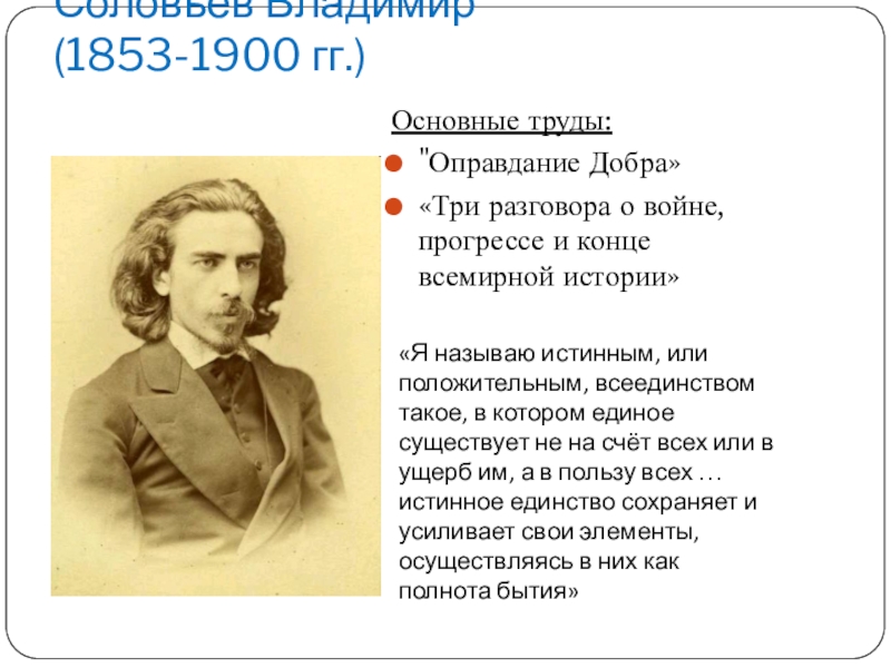 «Я называю истинным, или положительным, всеединством такое, в котором единое существует не на счёт всех или в ущерб им, а в пользу всех … истинное единство сохраняет и усиливает свои элементы, осуществляясь в них как полнота бытия»