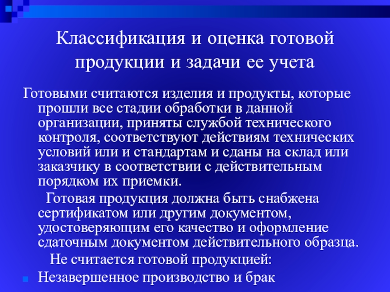 Слайд 9Классификация и оценка готовой продукции и задачи ее учета