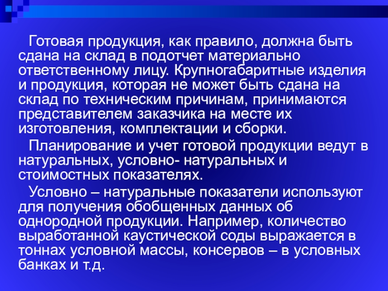 Планирование и учет готовой продукции ведут в натуральных, условно- натуральных и стоимостных показателях.