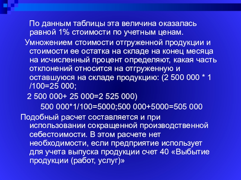 Умножением стоимости отгруженной продукции и стоимости ее остатка на складе на конец месяца на исчисленный процент определяют, какая часть отклонений относится на отгруженную и оставшуюся на складе продукцию: (2 500 000 * 1 /100=25 000;