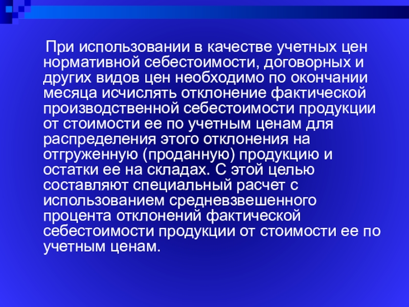 и других видов цен необходимо по окончании месяца исчислять отклонение фактической производственной себестоимости продукции от стоимости ее по учетным ценам для распределения этого отклонения на отгруженную (проданную) продукцию и остатки ее на складах. С этой целью составляют специальный расчет с использованием средневзвешенного процента отклонений фактической себестоимости продукции от стоимости ее по учетным ценам.
