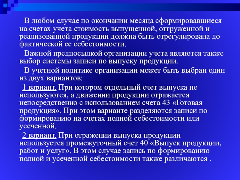 1 вариант. При котором отдельный счет выпуска не используются, а движении продукции отражается непосредственно с использованием счета 43 «Готовая продукция». При этом варианте разделяются записи по формированию на счетах полной себестоимости или усеченной.
