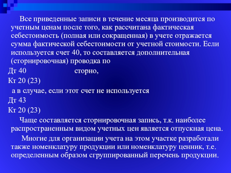 производится по учетным ценам после того, как рассчитана фактическая себестоимость (полная или сокращенная) в учете отражается сумма фактической себестоимости от учетной стоимости. Если используется счет 40, то составляется дополнительная (сторнировочная) проводка по