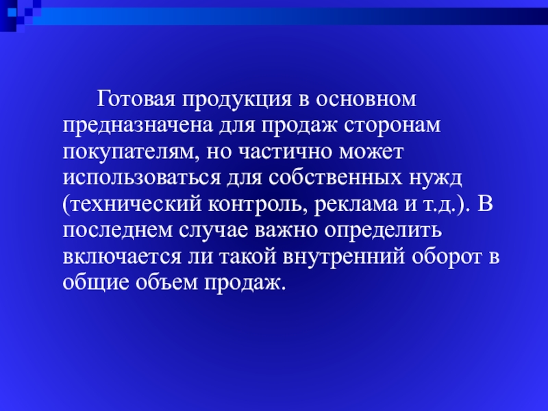 продаж сторонам покупателям, но частично может использоваться для собственных нужд (технический контроль, реклама и т.д.). В последнем случае важно определить включается ли такой внутренний оборот в общие объем продаж.