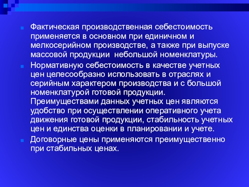 Слайд 5Фактическая производственная себестоимость применяется в основном при единичном и мелкосерийном производстве,