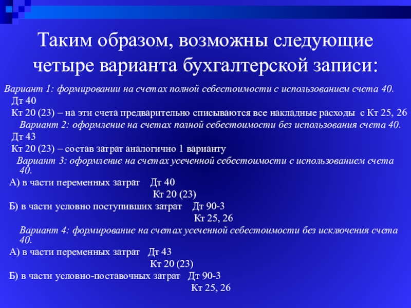 Вариант 4: формирование на счетах усеченной себестоимости без исключения счета 40.