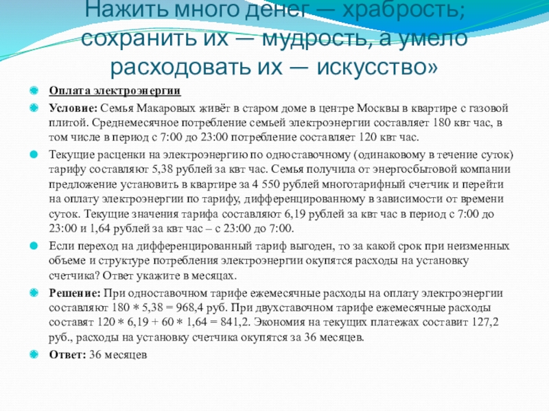 Условие: Семья Макаровых живёт в старом доме в центре Москвы в квартире с газовой плитой. Среднемесячное потребление семьей электроэнергии составляет 180 квт час, в том числе в период с 7:00 до 23:00 потребление составляет 120 квт час.