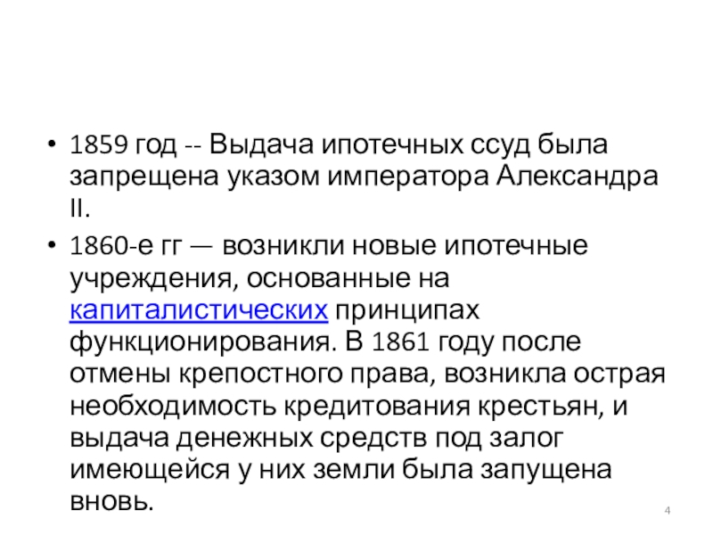 Слайд 41859 год -- Выдача ипотечных ссуд была запрещена указом императора Александра