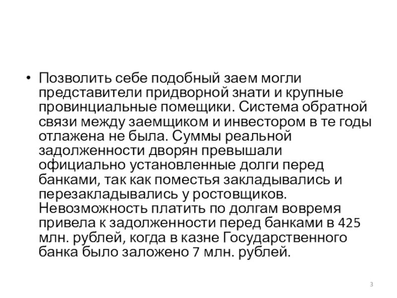 помещики. Система обратной связи между заемщиком и инвестором в те годы отлажена не была. Суммы реальной задолженности дворян превышали официально установленные долги перед банками, так как поместья закладывались и перезакладывались у ростовщиков. Невозможность платить по долгам вовремя привела к задолженности перед банками в 425 млн. рублей, когда в казне Государственного банка было заложено 7 млн. рублей.