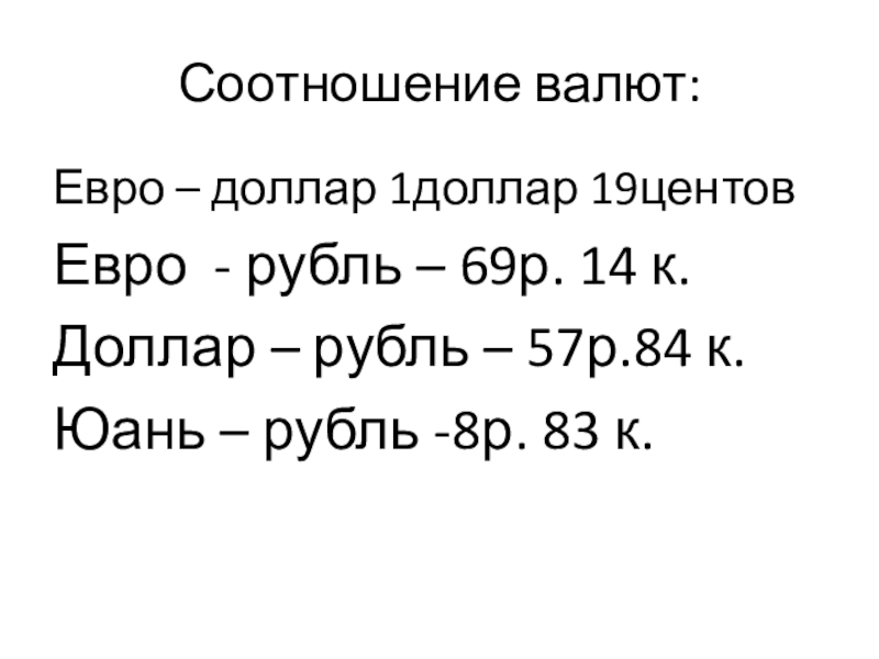 Соотношение валют:Евро – доллар 1доллар 19центовЕвро - рубль – 69р. 14 к.Доллар – рубль – 57р.84 к.Юань
