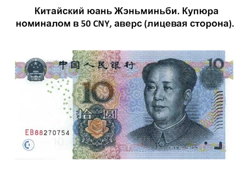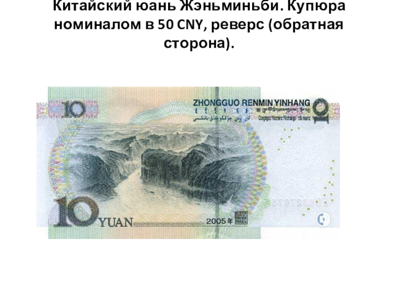 Слайд 10 Китайский юань Жэньминьби. Купюра номиналом в 50 CNY, аверс (лицевая