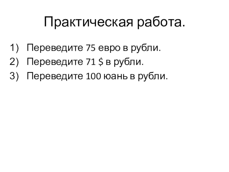 Практическая работа.Переведите 75 евро в рубли.Переведите 71 $ в рубли.Переведите 100 юань в рубли.
