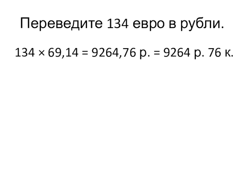 Переведите 134 евро в рубли.134 × 69,14 = 9264,76 р. = 9264 р. 76 к.