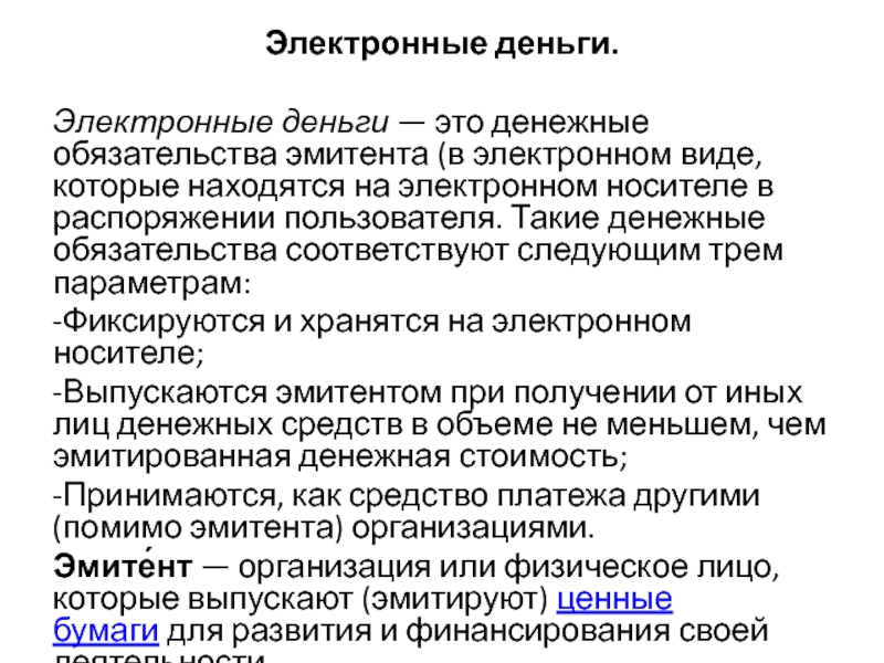 Электронные деньги — это денежные обязательства эмитента (в электронном