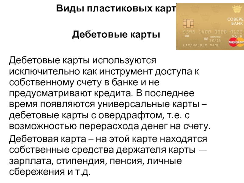 собственному счету в банке и не предусматривают кредита. В последнее время появляются универсальные карты – дебетовые карты с овердрафтом, т.е. с возможностью перерасхода денег на счету.