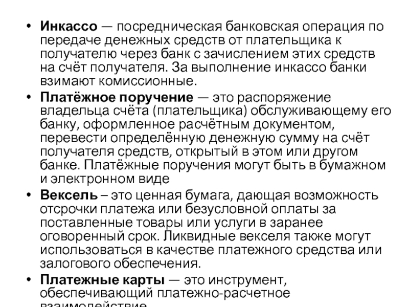 Слайд 18Инкассо — посредническая банковская операция по передаче денежных средств от плательщика