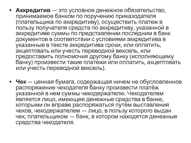 Слайд 17Аккредитив — это условное денежное обязательство, принимаемое банком по поручению приказодателя