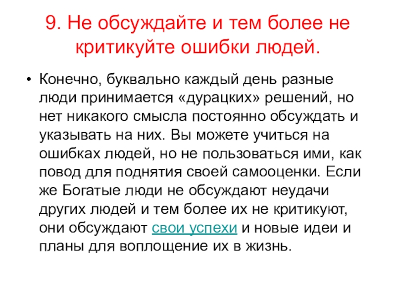 каждый день разные люди принимается «дурацких» решений, но нет никакого смысла постоянно обсуждать и указывать на них. Вы можете учиться на ошибках людей, но не пользоваться ими, как повод для поднятия своей самооценки. Если же Богатые люди не обсуждают неудачи других людей и тем более их не критикуют, они обсуждают свои успехи и новые идеи и планы для воплощение их в жизнь.