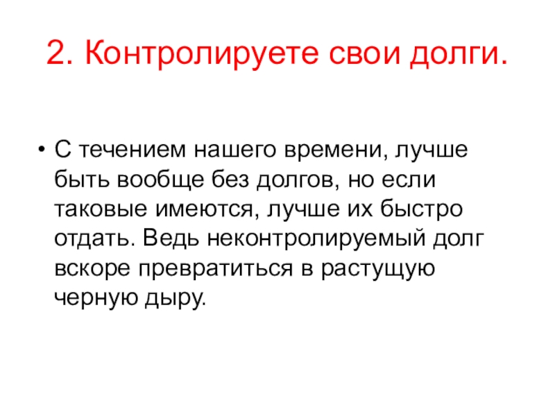 долгов, но если таковые имеются, лучше их быстро отдать. Ведь неконтролируемый долг вскоре превратиться в растущую черную дыру.