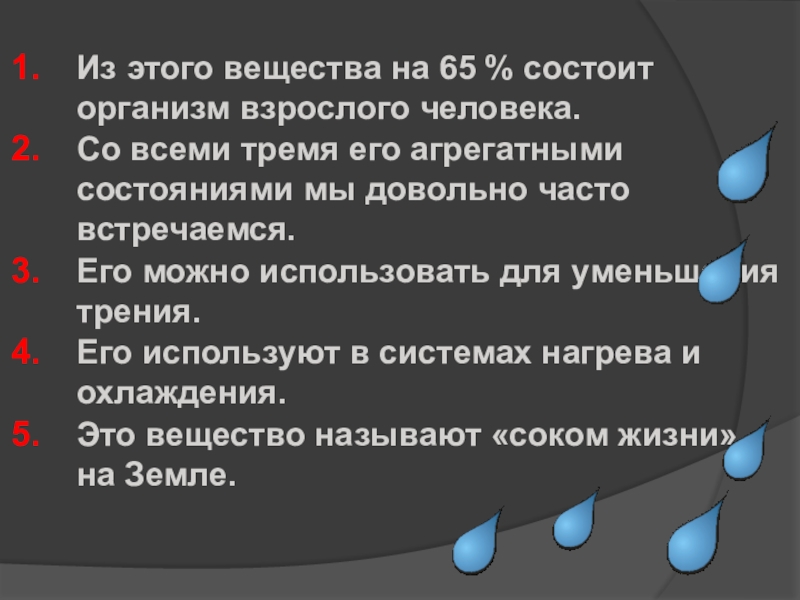 Слайд 22Из этого вещества на 65 % состоит организм взрослого человека.