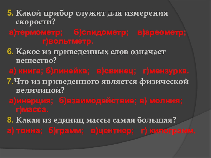 а) книга; б)линейка; в)свинец; г)мензурка.