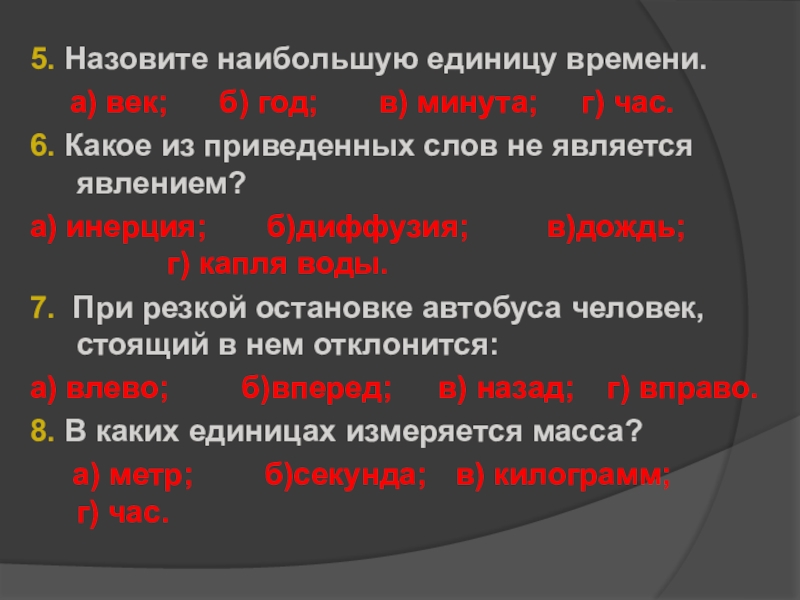 7. При резкой остановке автобуса человек, стоящий в нем отклонится: