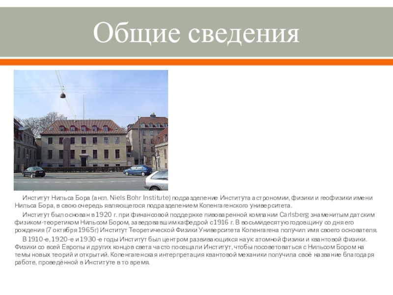 Общие сведенияИнститут Нильса Бора в КопенгагенеИнститут Нильса Бора (англ. Niels Bohr Institute) подразделение Института астрономии, физики и